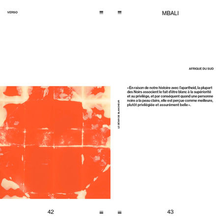Le désir de blancheur est un livre d’artiste sur le thème de la dépigmentation volontaire de la peau à l’aide de produits chimiques, une pratique principalement féminine qui a malheureusement encore cours aujourd’hui. Le livre réunit des textes informatifs, des témoignages de femmes (surtout d’origine africaine) et des explorations artistiques que j’ai faites avec des papiers de couleurs et de l’eau de Javel. Le papier, brûlé et dégradé, devient ainsi une métaphore de la peau, et la couverture du livre, en papier sablé, vise à susciter un inconfort.